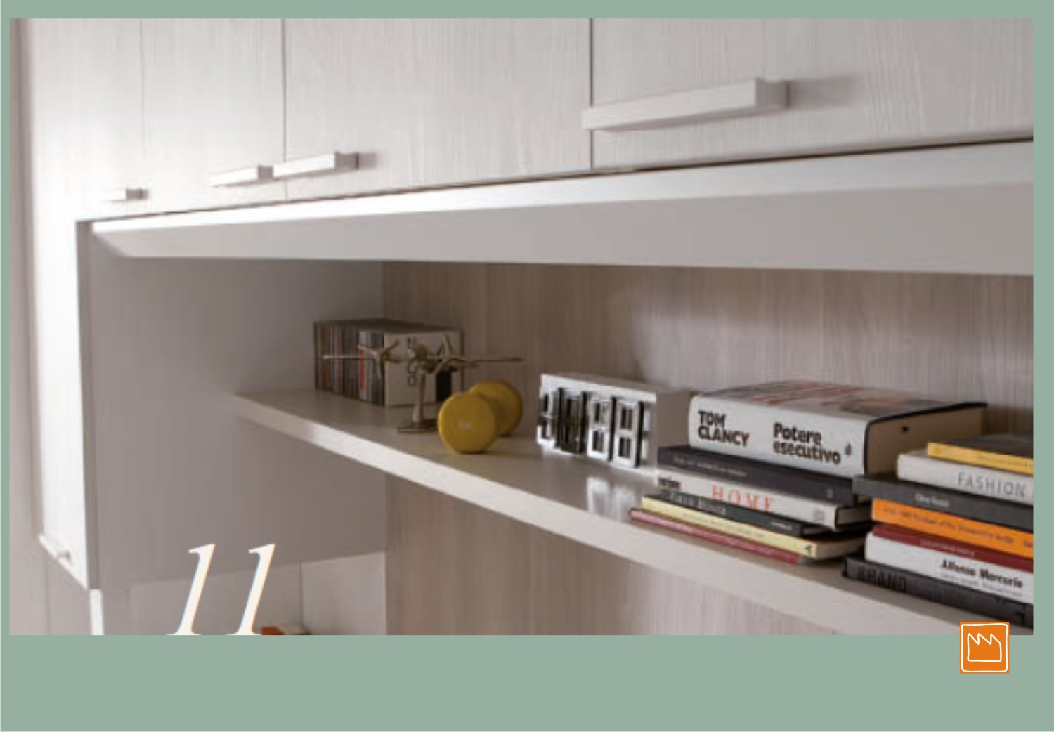 Abbiamo pensato a una soluzione compatta di armadio a ponte matrimoniale, che permette a chi ha una camera piccola di unire in un’unica parete di arredo l’armadio e il letto. La particolarità di questa soluzione sta nei due vani a giorno che interrompono le colonne ai lati del letto e fanno da comodino, oltre a lasciar passare più luce verso il letto che non resta “incastrato” semplicemente tra i fianchi degli armadi.