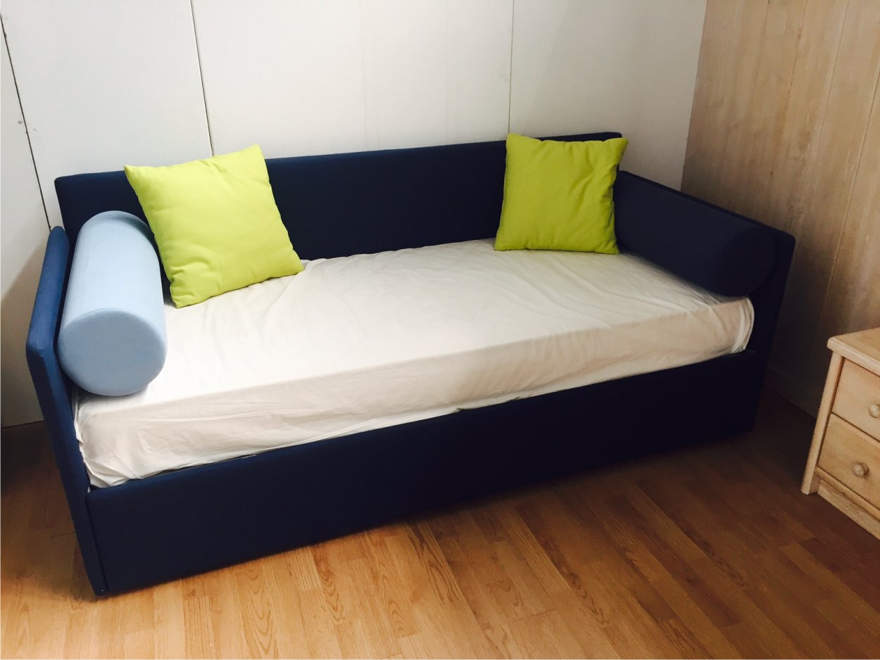 Un letto a divano imbottito con cassettoni portagiochi celati nella struttura. Il letto è rivestito in tessuto blu notte, con spalle a divano, i cassettoni si estraggono sollevando la fascia frontale e sono di colore bianco. Questo letto proviene dalla nostra esposizione di Veduggio con Colzano, in Brianza, ed è in offerta per rinnovo della mostra. Si tratta di un’occasione per acquistare un letto imbottito singolo a prezzo ridotto, non si tratta comunque di un letto usato. Il tessuto di rivestimento è completamente sfoderabile, la rete a doghe compresa nel costo è ortopedica, in listelli di faggio.
