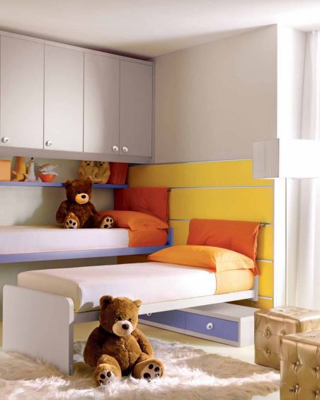 Il Ponte Lineare è abbinato in questa composizione con un sistema a boiserie moderna. La Boiserie è una pannellatura componibile su misura in altezza e larghezza, attrezzata con cremagliera orizzontale che permette lo scorrimento di letti e scrittoi su binario. La possibilità dell’inserimento nei pannelli della Boiserie, di un elemento in plexiglas, permette di avere una retro illuminazione o di apporre foto ed immagini che si possono nel tempo sostituire. I vantaggi derivanti dall’utilizzo del sistema a Boiserie sono legati al suo pratico sistema a scorrimento che permette di compattare durante il giorno due letti nello spazio di uno. Sotto i pannelli Boiserie si possono inserire delle basi a cassetti che fungono sia da contenimento che da appoggio e comodino. L’integrazione della Boiserie con un ponte lineare e colonne a terra rende ancora più compatta, funzionale e capiente l’intera composizione, ottimizzando in tal modo lo spazio antistante dedicato al gioco ed allo svago. L’insieme assume un connotato molto pratico ed elegante ed i colori utilizzati, dai toni intensi ed a contrasto, caratterizzano esteticamente la composizione dandole uno stile vivace. I colori della composizione sono: zafferano, tortora, bianco e melanzana.