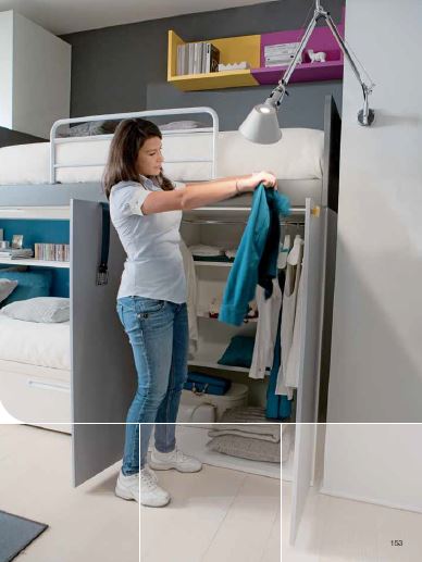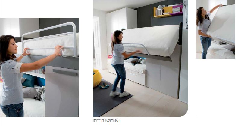 Il castelponte lineare ha un guardaroba attrezzato piuttosto sostanzioso, soprattutto grazie alla piccola cabina armadio composta dalle due ante basse. La scala per raggiungere il letto alto è fissa ma ci sono delle soluzioni alternative con letto alto scorrevole e scala laterale a cassettoni per chi il letto alto lo deve usare nella quotidianità. Per agevolare il rifacimento del letto è possibile usufruire del binario che permette di inclinare la rete abbassandola di 45cm. Il letto basso modello Arkimede può essere munito di ruote per un agile spostamento monodirezionale. Una soluzione ottima per risparmiare spazio attrezzando comunque una cameretta doppia. Consigliata per chi ha uno spazio da arredare stretto e lungo dove tutto deve stare possibilmente in una sola parete.