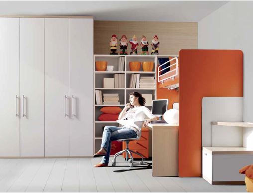 Misure della cameretta: L’ingombro totale è di 392 x 300 cm. In foto la cameretta è proposta con diversi abbinamenti di colori: (arancione, bianco e rovere), (azzurro bianco e rovere), (verde, bianco e rovere).