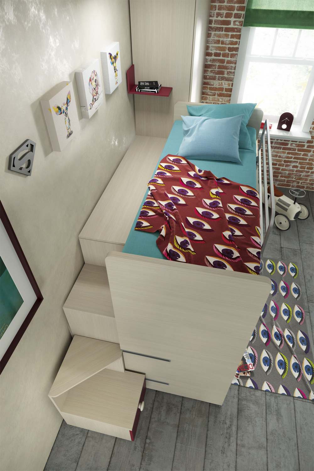 Misure della cameretta: la cameretta misura 392 cm x 97.5 cm, una soluzione salva spazio, ideata per integrare alla struttura dei letti scorrevoli a soppalco l’armadiatura che sfrutta al meglio la profondità e può essere personalizzata in diverse misure. Una cameretta a soppalco con armadiatura integrata, una struttura che permette di risparmiare spazio. In foto la cameretta è proposta nei colori rovere e rosso.